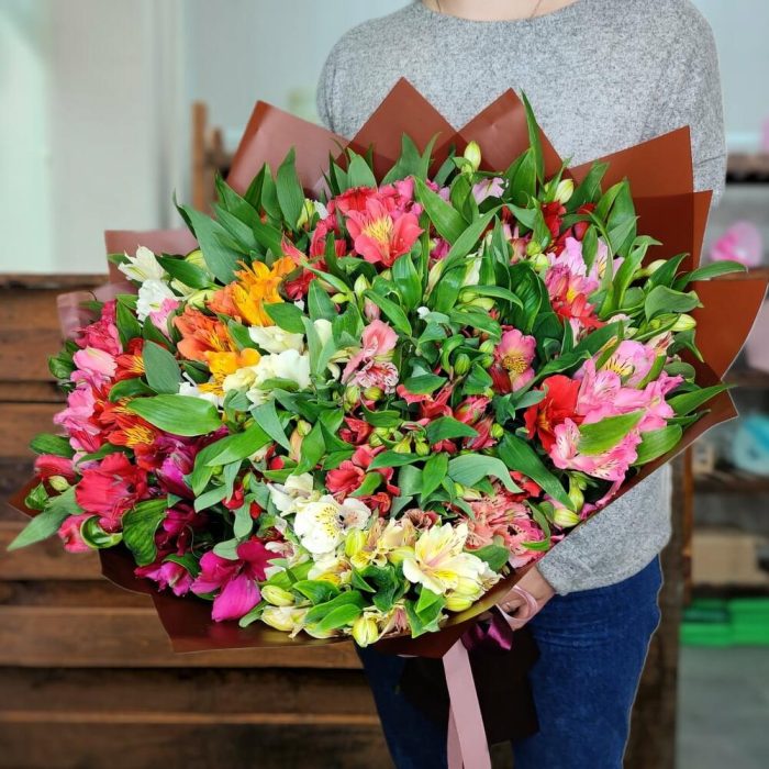Лента – 1 шт. разноцветная альстромерия – 51 шт. Современная упаковка – 1 шт.