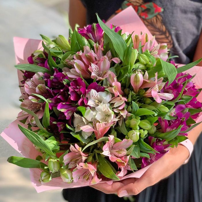 Альстромерия белая – 5 шт. Альстромерия розовая – 5 шт. Альстромерия малиновая – 5 шт. Упаковка пленка матовая – 1 шт.
