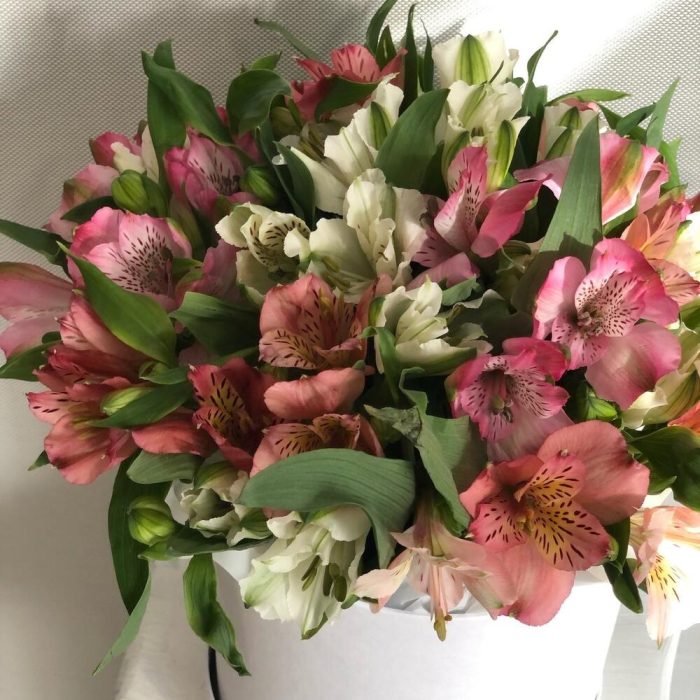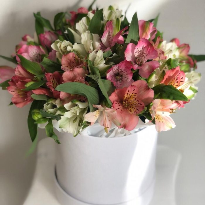 Композиция в коробке из стойких и красивых альстромерий