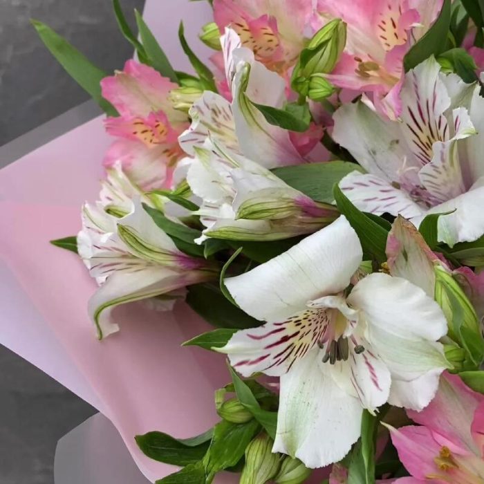 Лента атласная – 1 шт.Альстромерия белая – 7 шт.Альстромерия розовая – 8 шт.Дизайнерская упаковка – 3 шт.
