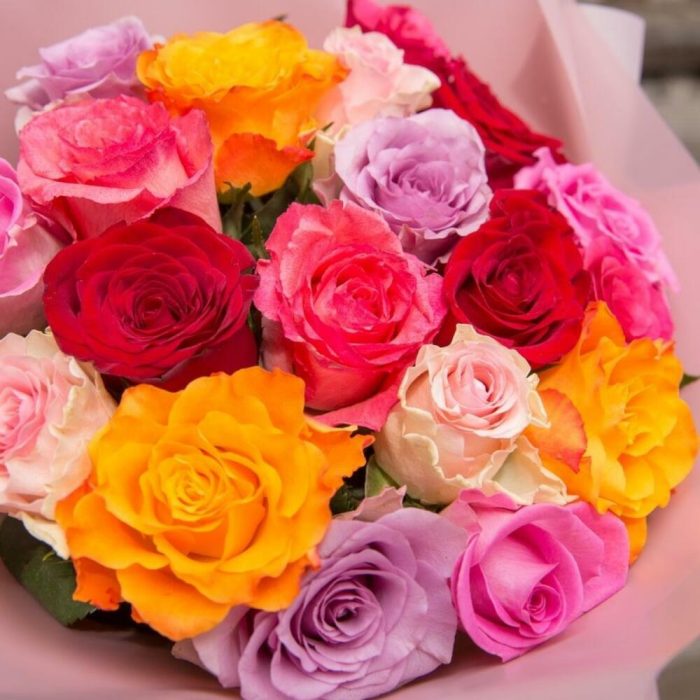 Multicoloured roses in stylish matte wrap film. Recipients will definitely appreciate these long-lasting roses.