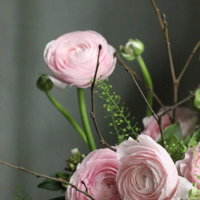 Букет с нежными ранункулюсами, ирландскими колокольчиками, ветвями и пастушьей сумкой.