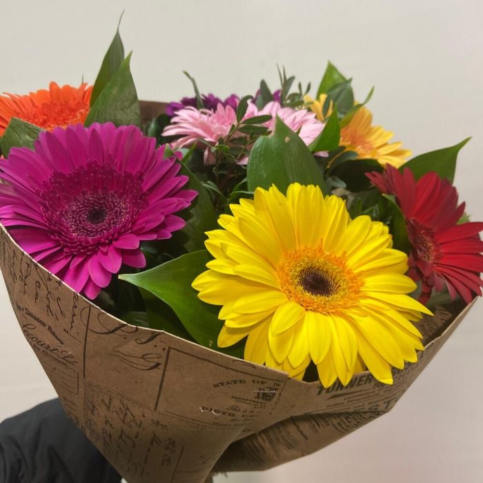 гербера микс – 7 шт.Рускус – 11 шт.Фисташка – 2 шт.Упаковка крафт дизайнерский – 1 шт.Лента – 1 шт.