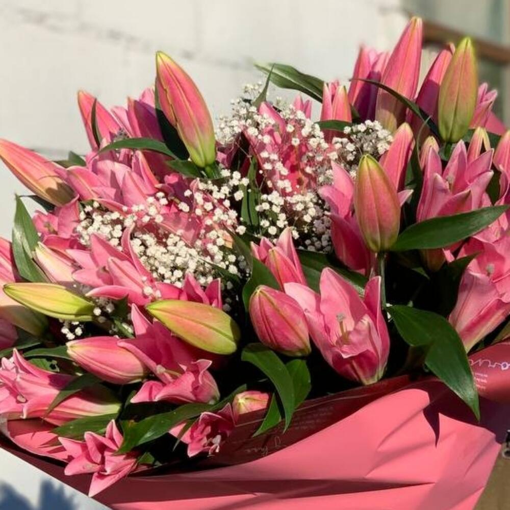Лилия розовая – 9 шт.Гипсофила – 3 шт.Упаковка дизайнерская – 1 шт.
