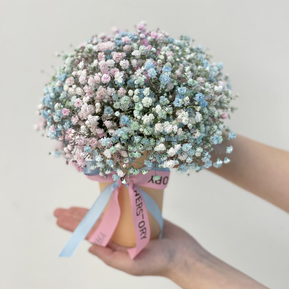 Композиция из сухоцветов и стабилизированных цветов в белом кашпо