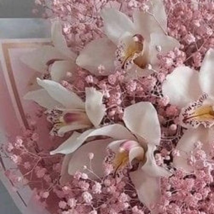 Гипсофила – 6 шт.Орхидея Цимбидиум – 5 шт.Лента атласная – 2 шт.Упаковка дизайнерская – 2 шт.