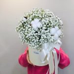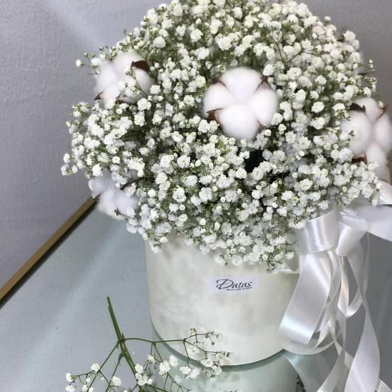 Гипсофила – 10 шт.Лента – 1 шт.Хлопок – 7 шт.биафлора – 1 шт.шляпная коробка d16 см – 1 шт.