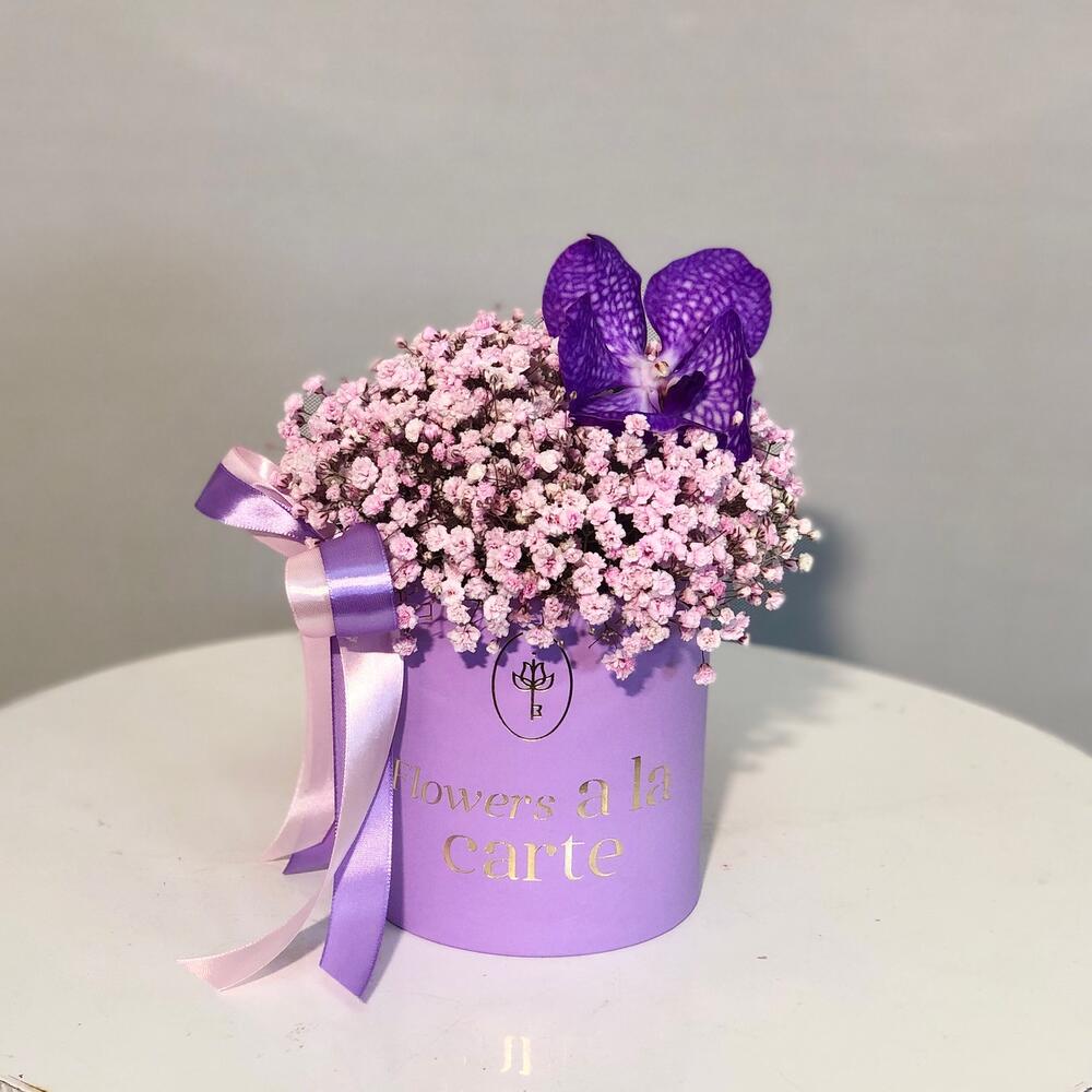 Гипсофила – 4 шт.Орхидея Ванда – 1 шт.Лента атласная – 2 шт.Оазис флористический – 1 шт.коробка шляпная маленькая – 1 шт.