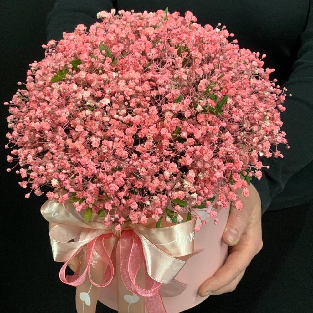 Гипсофила – 5 шт.Оазис флористический – 1 шт.Шляпная коробка – 1 шт.Атласная лента – 2 шт.Фисташка – 3 шт.