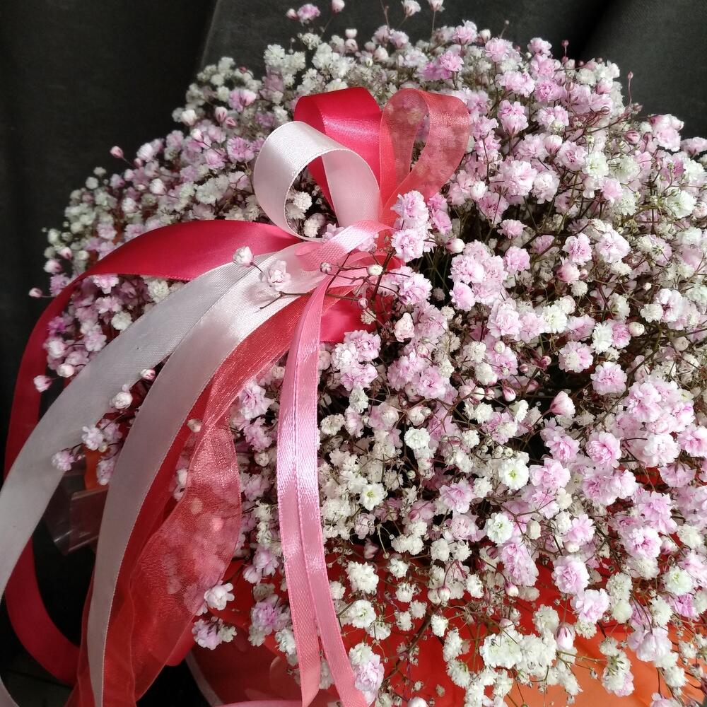 Гипсофила – 15 шт.Шляпная коробка – 1 шт.Оазис флористический – 1 шт.Упаковка дизайнерская – 2 шт.Лента атласная – 3 шт.