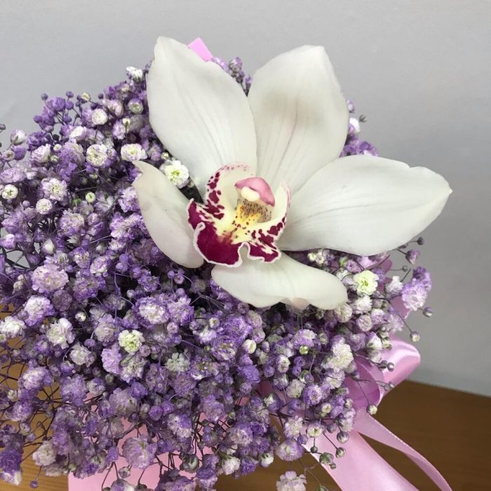 Гипсофила – 4 шт.Орхидея Цимбидиум – 1 шт.Оазис флористический – 1 шт.Стакан – 1 шт.оформление флоамиран – 1 шт.