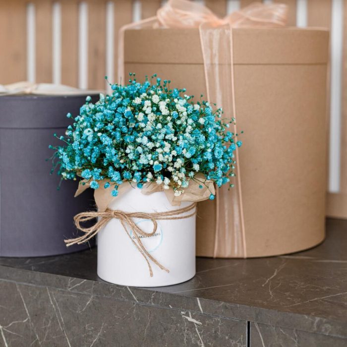 “Сиреневый туман” – композиция из гипсофилы в шляпной коробке