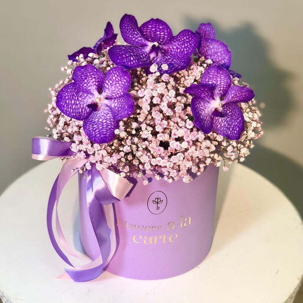 Орхидея Ванда с гипсофилой в коробке L