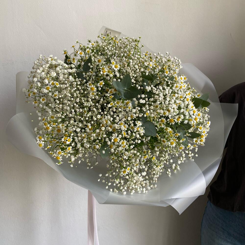 Стильный и пышный букет из стойкой гипсофилы, летних ромашек и ароматного эвкалипта