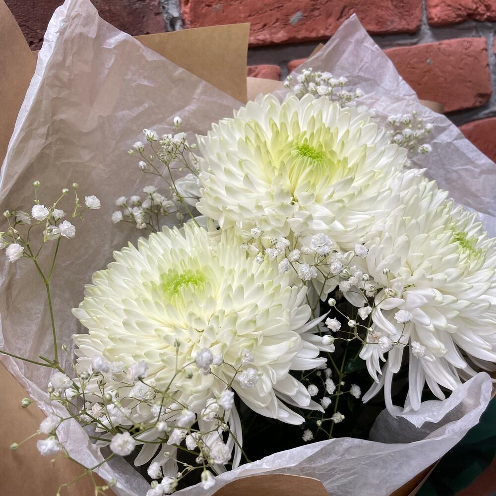 Гипсофила – 2 шт.Лента – 1 шт.Упаковка дизайнерская – 1 шт.магнум белый – 3 шт.
