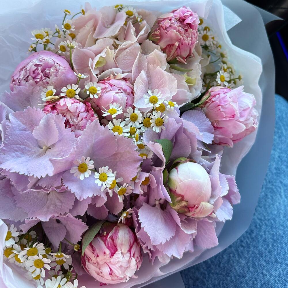 Авторский букет из гортензий, пионов и ромашек