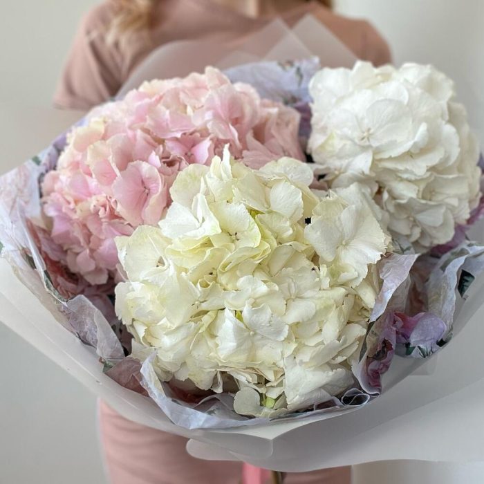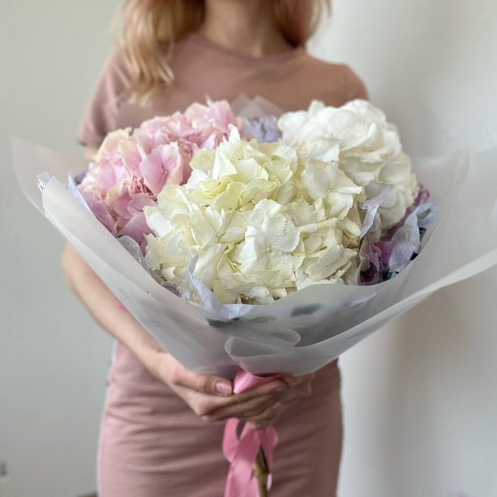 Упаковка – 1 шт.Лента атласная – 1 шт.Тишью – 1 шт.гортензия голландия – 3 шт.