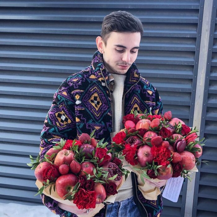 яблоки – 8 шт.гранаты – 3 шт.розы – 6 шт.Гвоздика – 5 шт.Клубника – 5 шт.Пирожные макарон – 4 шт.зелень фисташки – 3 шт.Лагурус – 4 шт.