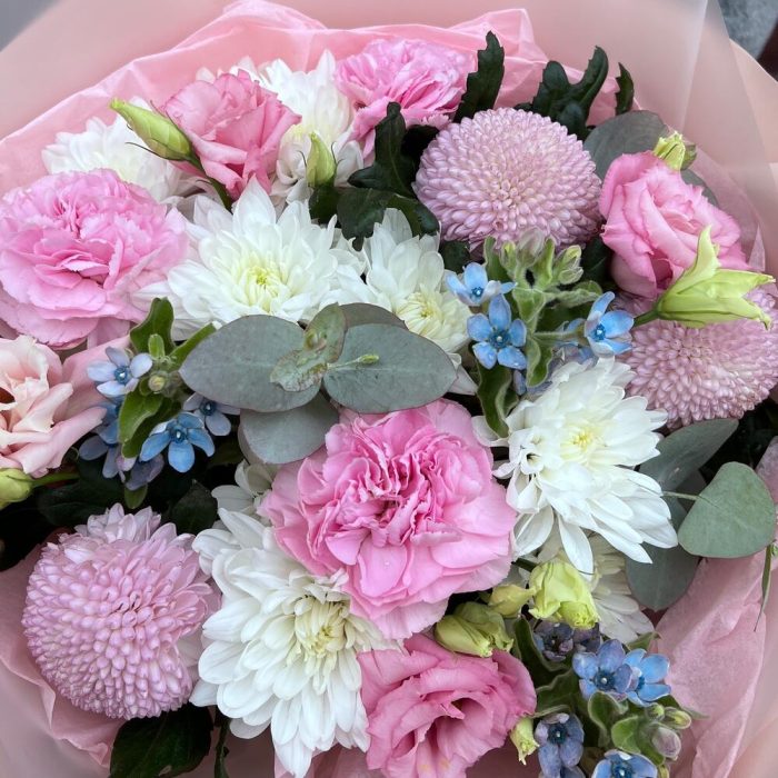 эустома розовая махровая – 1 шт.Оксипеталум – 3 шт.Хризантема момоко – 3 шт.Хризантема кустовая – 2 шт.Диантус – 3 шт.Эвкалипт – 1 шт.Тишью – 1 шт.Пленка матовая – 5 шт.Лента атласная – 2 шт.