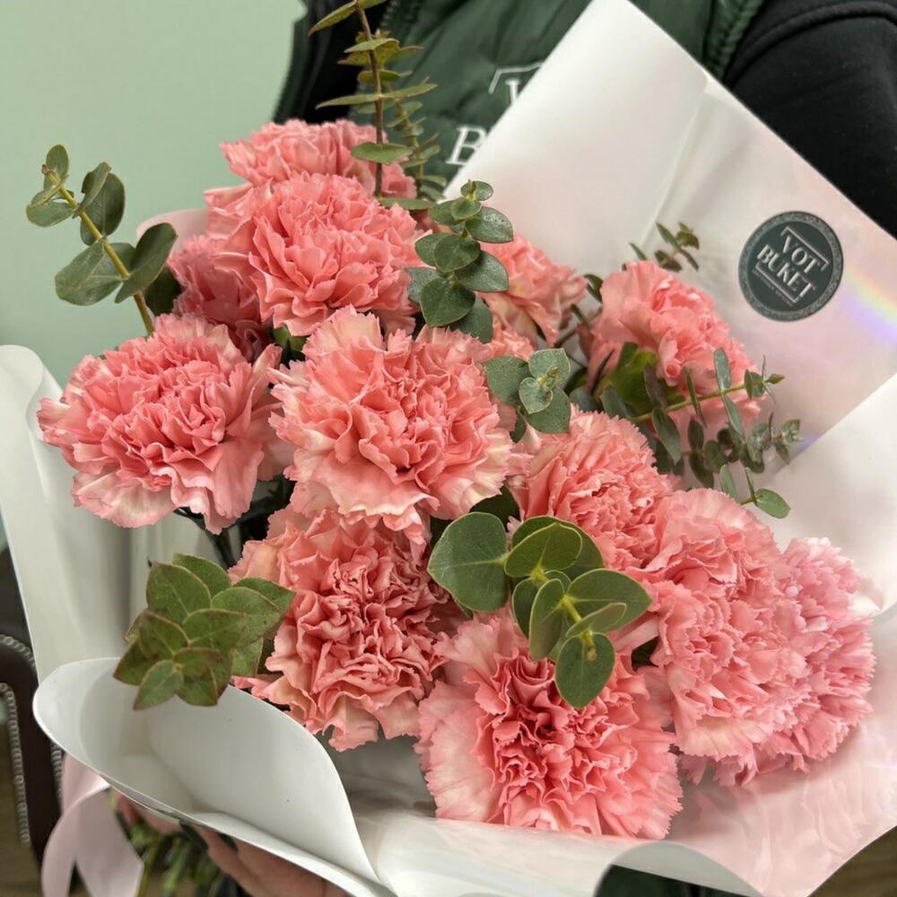 Диантус – 15 шт.Эвкалипт – 5 шт.Упаковка дизайнерская – 1 шт.