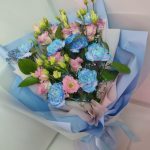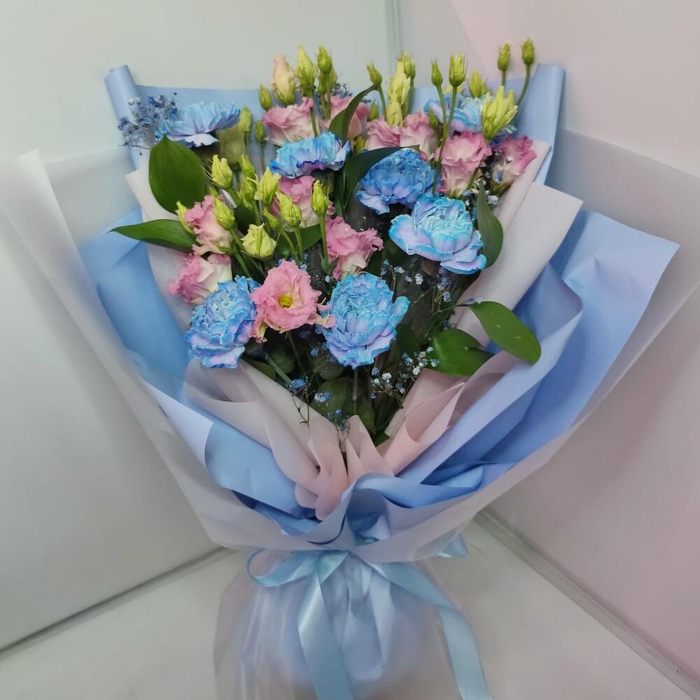 Лизиантус махровый розовый – 4 шт.диантусы голубые – 7 шт.гиасофила – 1 шт.Рускус – 3 шт.Дизайнерская упаковка – 1 шт.