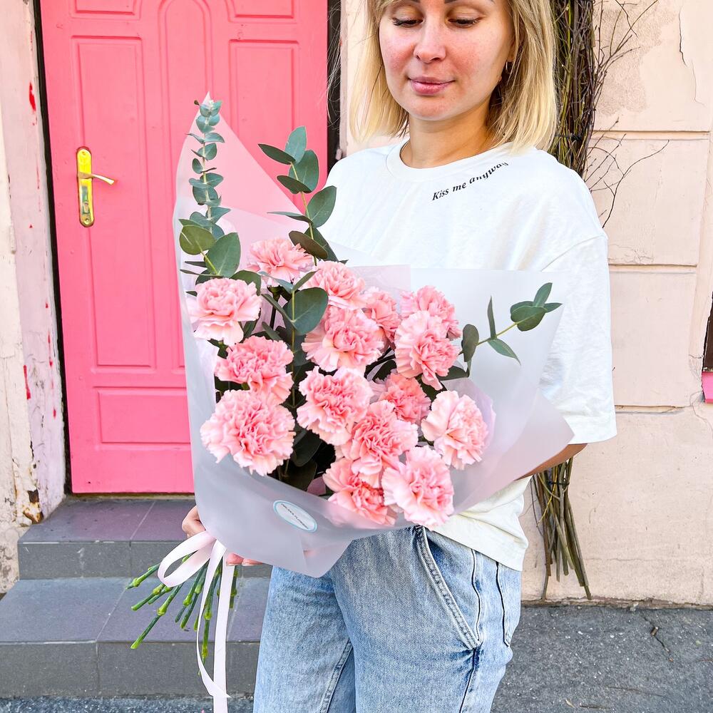 Диантус сортовой – 15 шт.Эвкалипт – 2 шт.Тишью – 1 шт.Корейская пленка – 2 шт.Лента атласная – 1 шт.Аквапак – 1 шт.