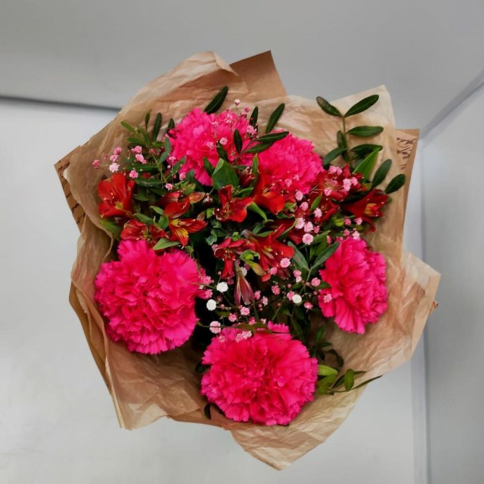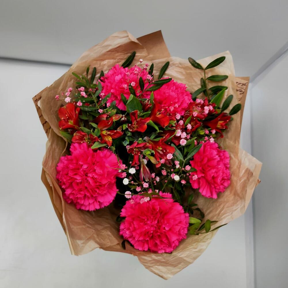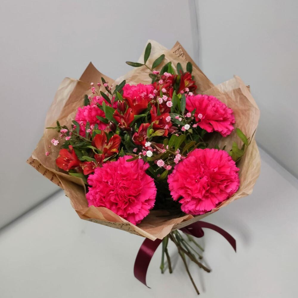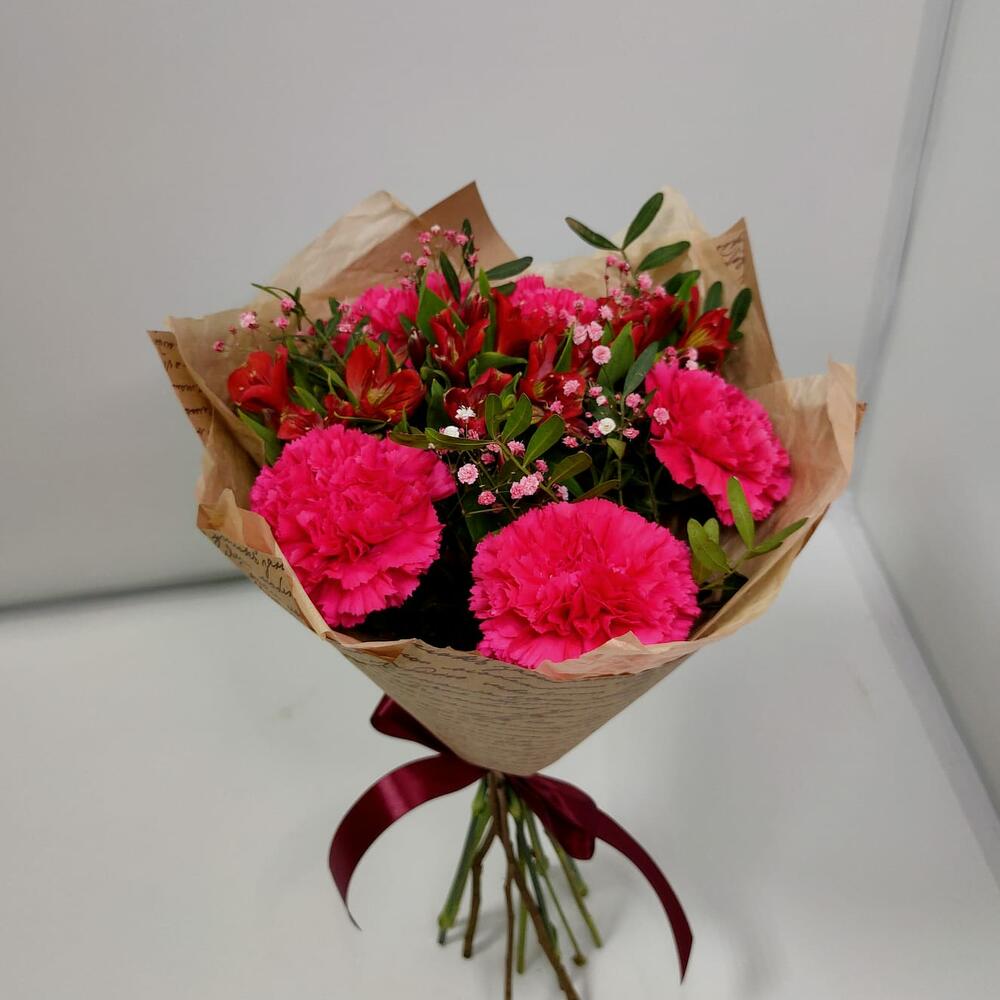 диантусы – 5 шт.Альстромерия – 3 шт.Гипсофила – 1 шт.зелень фисташки – 1 шт.Дизайнерская упаковка – 1 шт.
