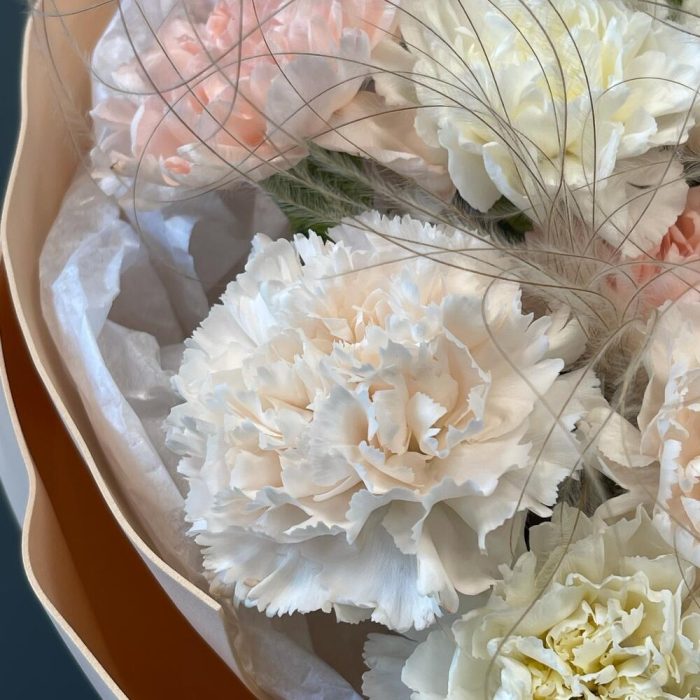 Лента – 2 шт.Тишью – 2 шт.Упаковка дизайнерская – 2 шт.Ковыль – 2 шт.Гвоздика одноголовая – 21 шт.