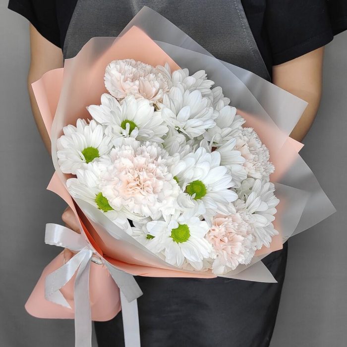 Лента атласная – 1 шт.Диантус – 4 шт.Хризантема кустовая ромашковая белая – 3 шт.упаковка флористическая – 1 шт.