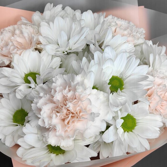Букет из ромашек и персиковых диантусов “Ваниль”