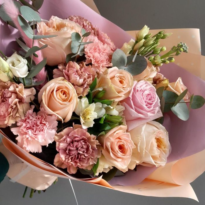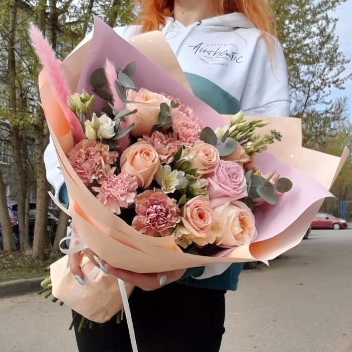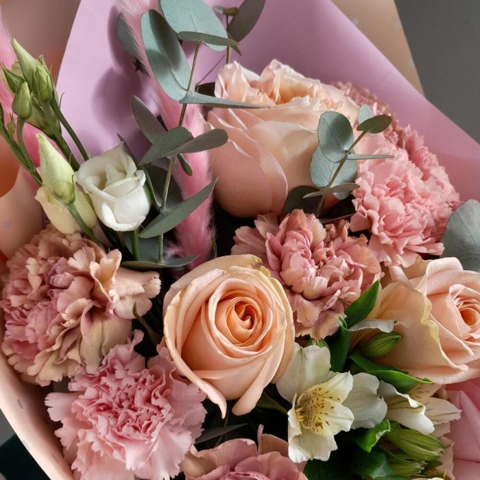 Роза – 8 шт.Диантус – 8 шт.Эустома – 2 шт.Маттиола – 1 шт.Альстромерия – 2 шт.Эвкалипт – 3 шт.Упаковка дизайнерская – 4 шт.Лента атласная – 2 шт.