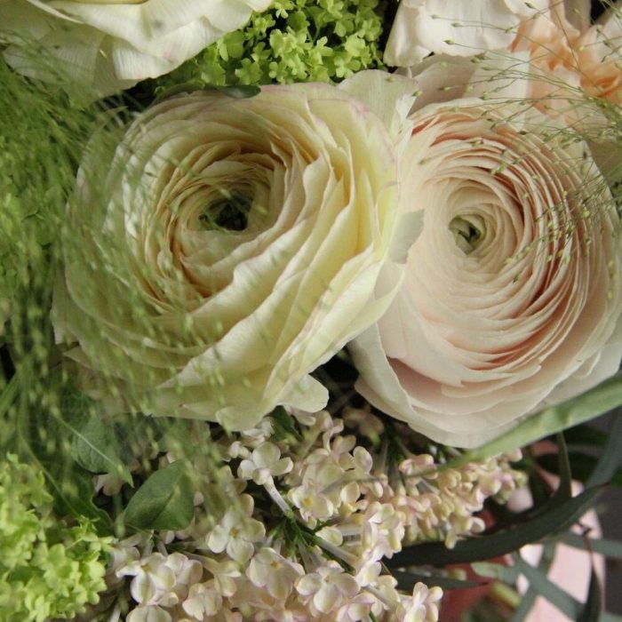 Вибурнум – 2 шт.Лента – 1 шт.Маттиола – 2 шт.Паникум – 2 шт.Сирень – 1 шт.Эвкалипт – 5 шт.Гвоздика – 3 шт.Ранункулюс – 3 шт.Львиный зев – 3 шт.