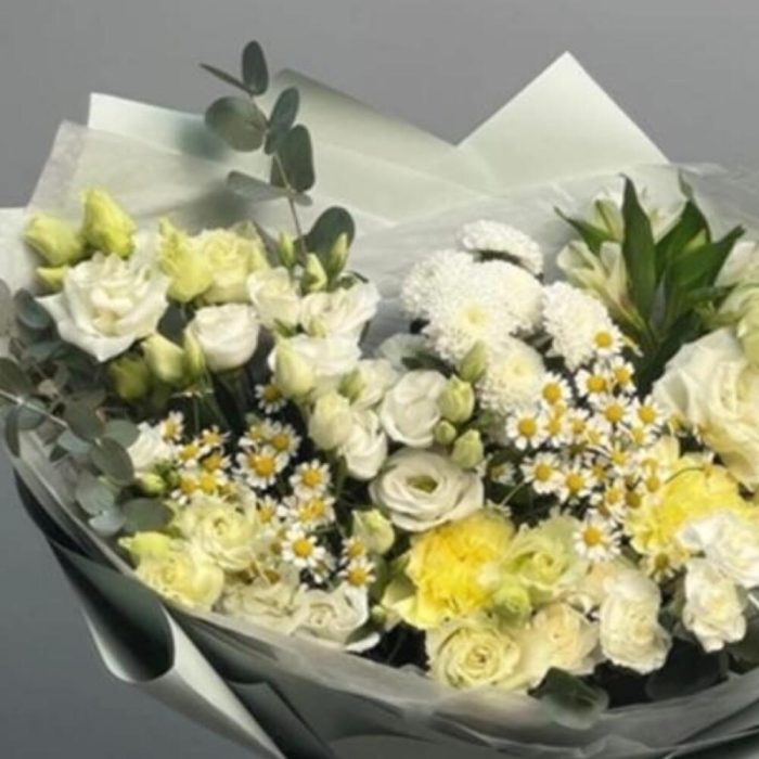 Альстромерия – 2 шт.Лизиантус – 5 шт.Хризантема Сантини – 3 шт.Гвоздика – 3 шт.Матрикария – 3 шт.Упаковка дизайнерская – 1 шт.