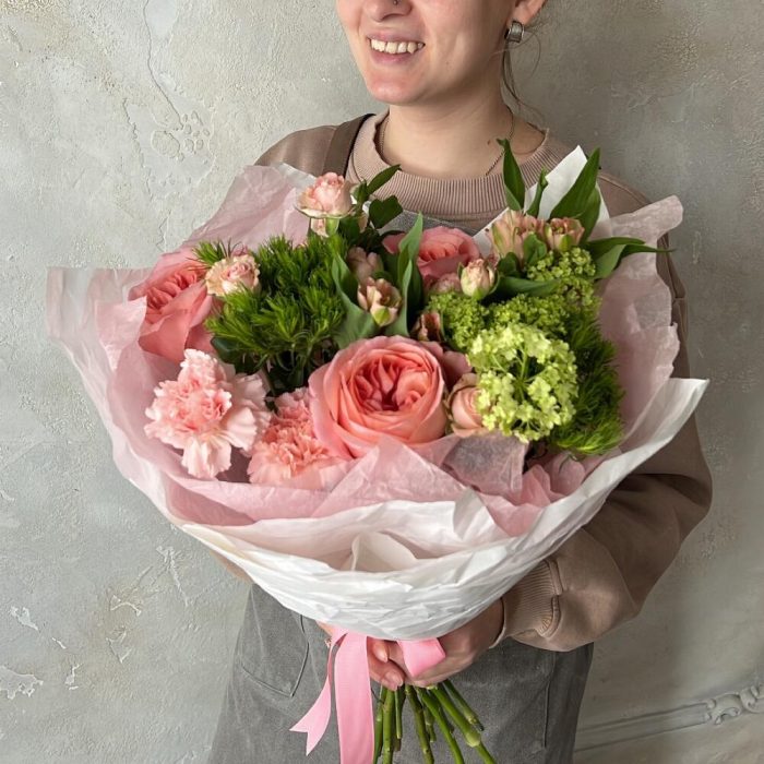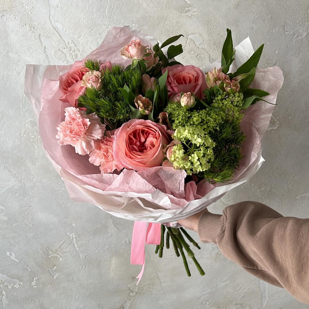 Альстромерия – 2 шт.Вибурнум – 1 шт.Роза кустовая – 1 шт.Гвоздика – 3 шт.Роза пионовидная – 3 шт.Упаковка дизайнерская – 1 шт.гринтрик – 2 шт.