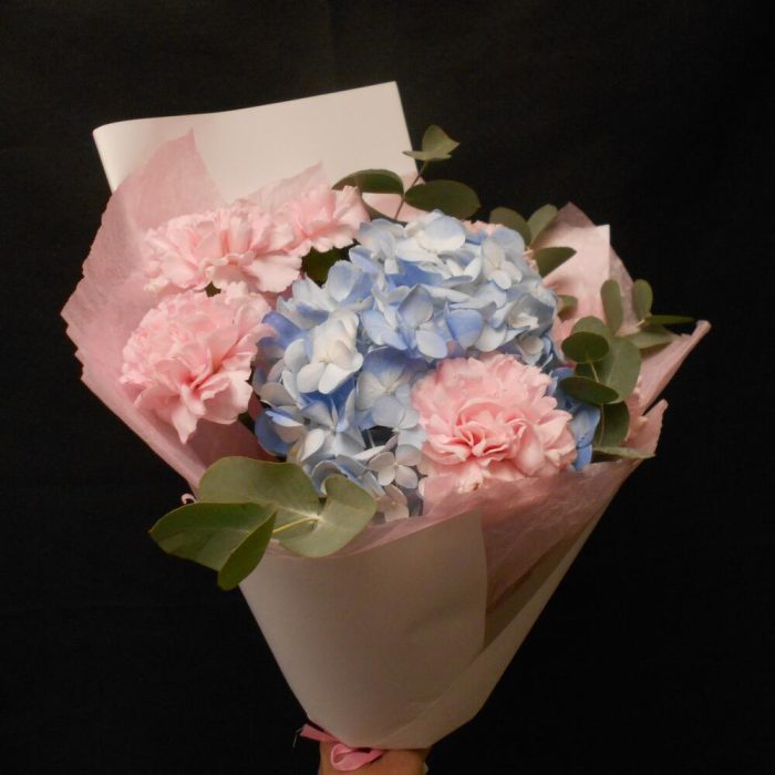 Лента атласная – 3 шт.Гортензия голубая – 1 шт.бумага тишью розовая – 3 шт.пленка матовая белая – 4 шт.гвоздики одноголовые розовые – 6 шт.ветви эвкалипта сухоцвет – 5 шт.