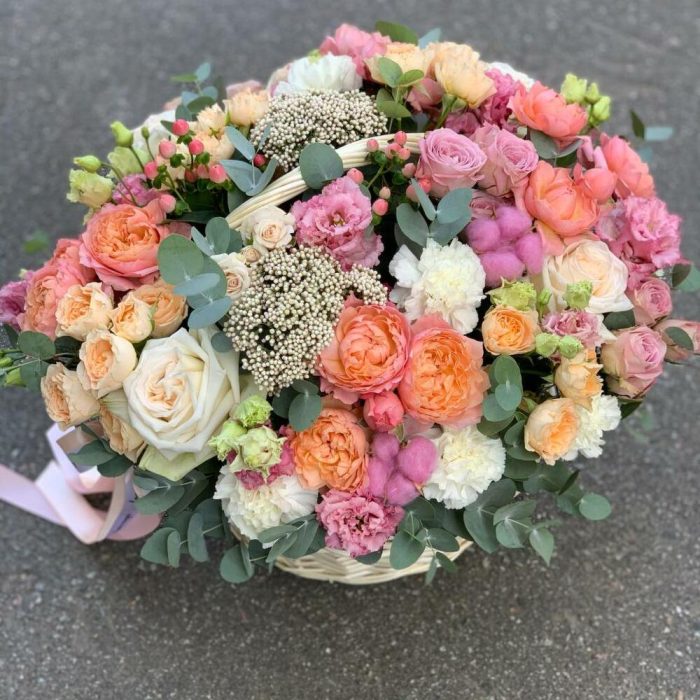 Корзина – 1 шт.Оазис – 3 шт.кустовые пионовидные розы – 5 шт.кустовые розы – 5 шт.Лизиантус – 5 шт.пионовидные розы – 5 шт.розы эскимо – 7 шт.гвоздики – 9 шт.Гиперикум – 2 шт.Озотамнус – 2 шт.Зелень – 5 шт.Хлопок – 5 шт.