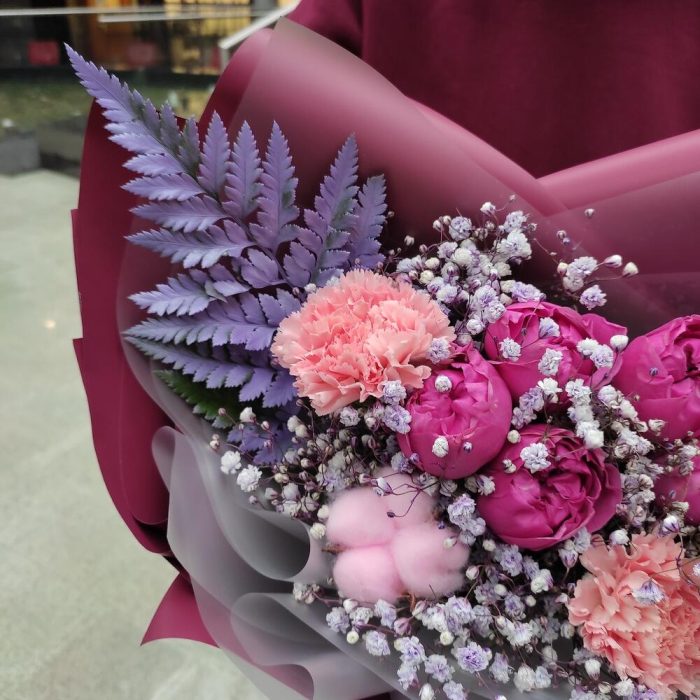 Гвоздика сортовая – 3 шт.Misty bubbles – 1 шт.Гипсофила – 1 шт.Хлопок натуральный – 1 шт.папоротник ветка – 1 шт.