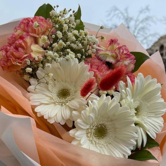 гербера белая мини – 3 шт.Гвоздика сортовая – 5 шт.Гипсофила – 1 шт.Салал пучок – 1 шт.Лагурус – 3 шт.Тишью – 4 шт.Пленка матовая – 6 шт.