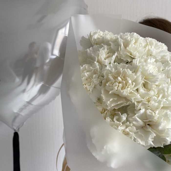 Эвкалипт – 1 шт.Белый диантус – 19 шт.сердце фольгированное с фотографиями – 1 шт.