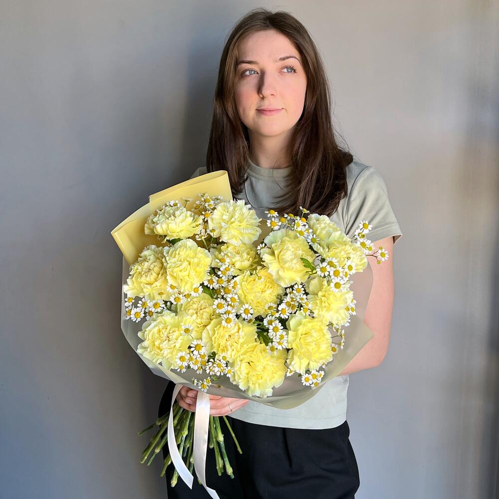 Букет солнечного настроения с ароматной голландской ромашкой! За счет своего состава букет будет долго стоять и радовать своей красотой:)Все наши букеты доставляются в воде!Не забудьте подрезать цветы перед тем как ставить в воду. Не храните букет на прямых солнечных … Показать ещёлучах и возле отопительных приборов, чтобы сохранить цветы как можно дольше.