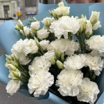 Лента атласная – 2 шт.Лизиантус белый – 5 шт.Упаковка корейская пленка – 1 шт.диантус белоснежный – 11 шт.