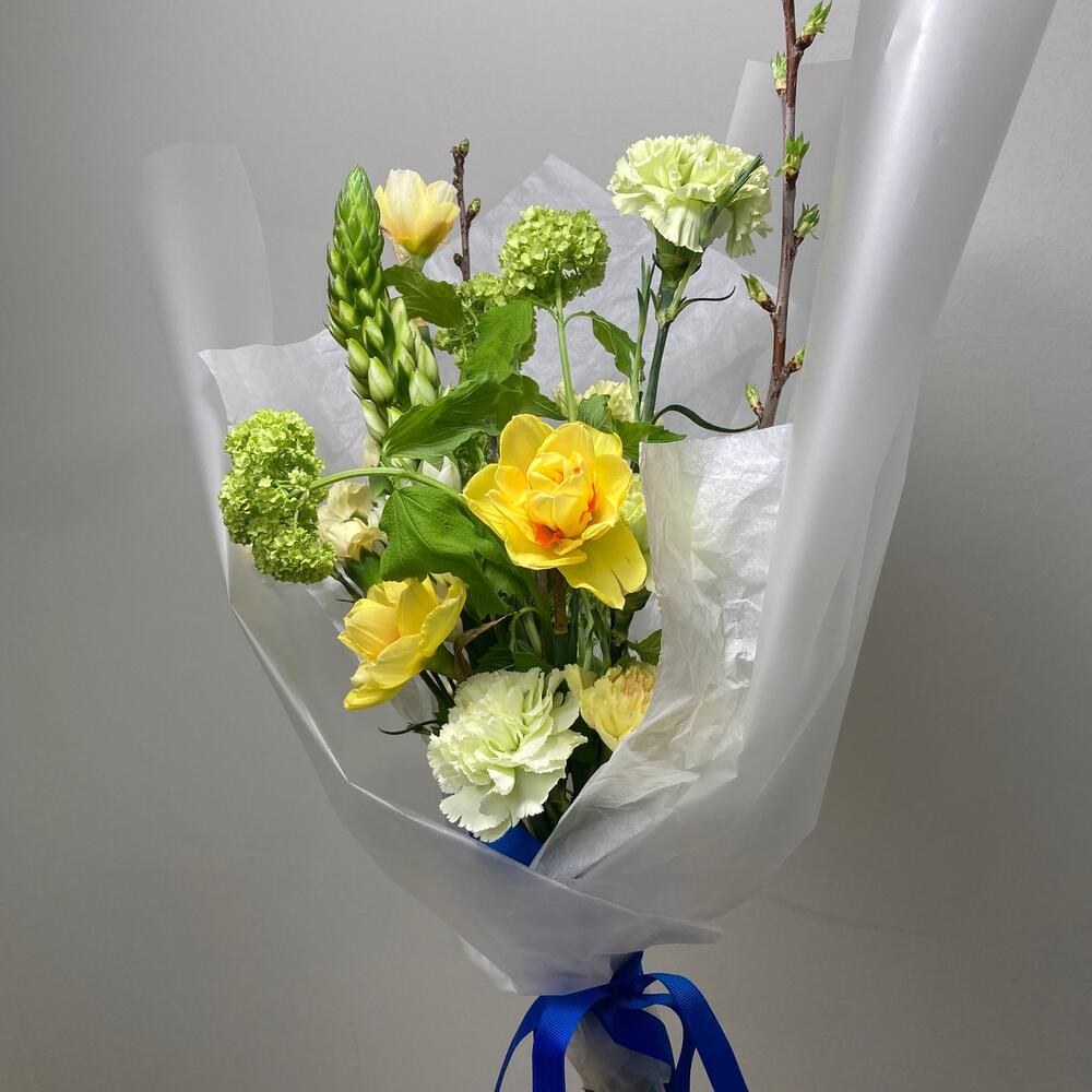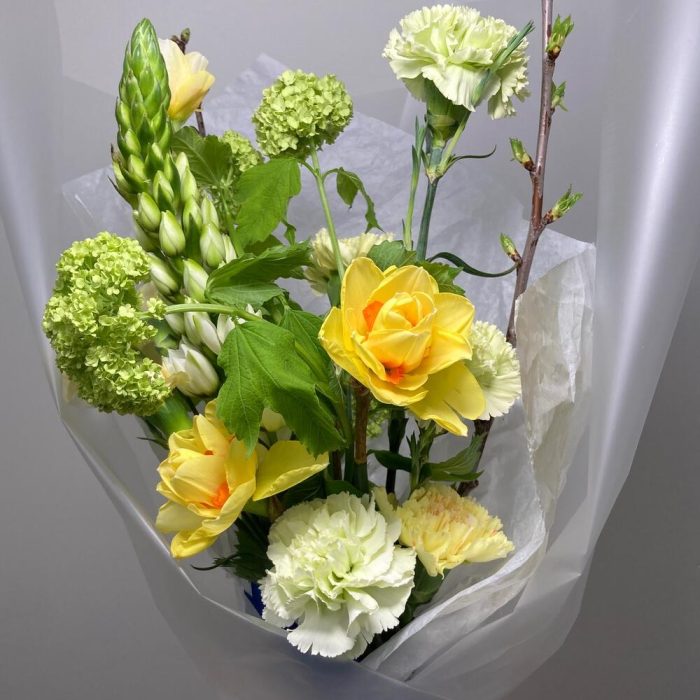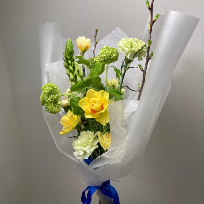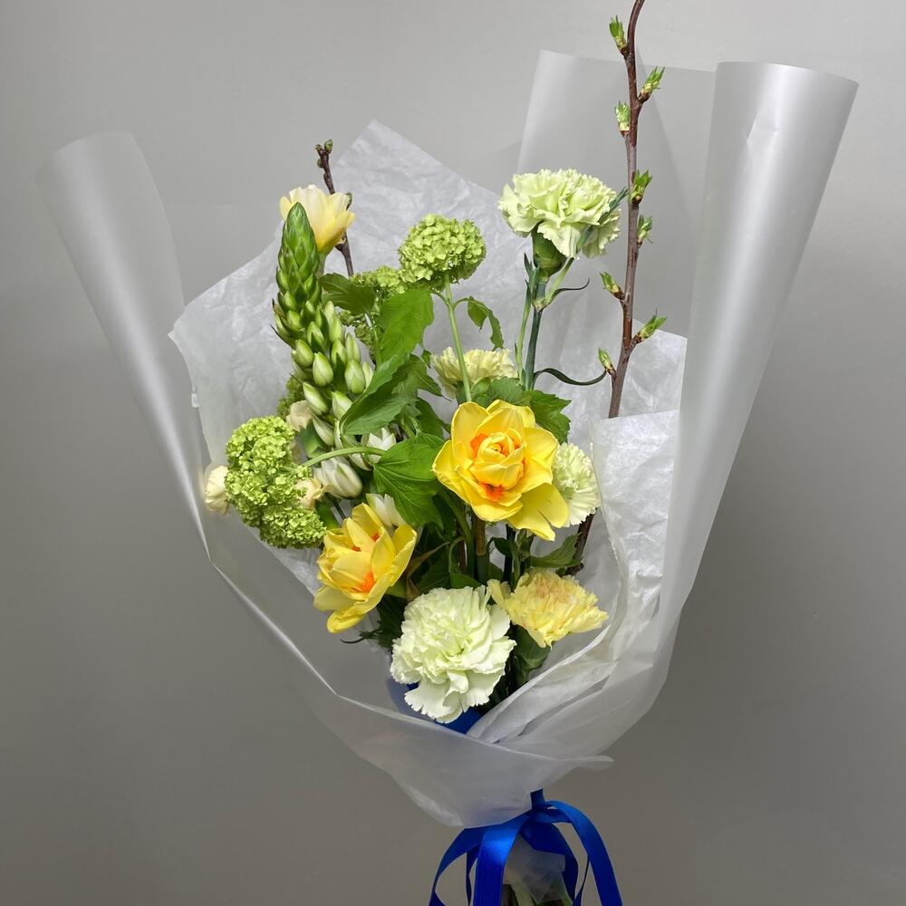 Вибурнум – 1 шт.Нарцисс – 3 шт.Гвоздика – 5 шт.Орнитогалум – 1 шт.Гвоздика кустовая – 1 шт.Прунус – 2 шт.