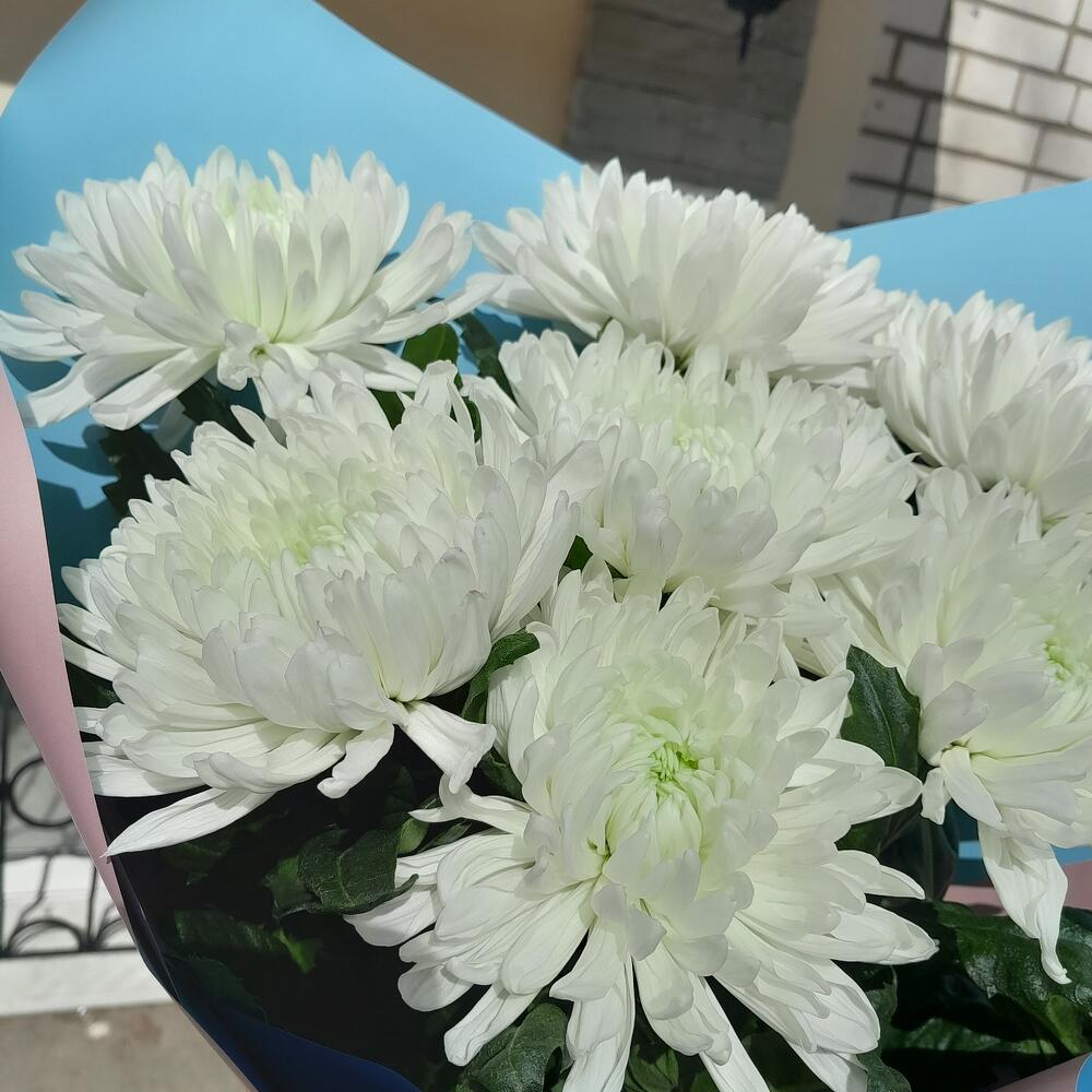 Хризантема Антонов – 7 шт.Упаковка дизайнерская – 2 шт.Лента атласная – 2 шт.