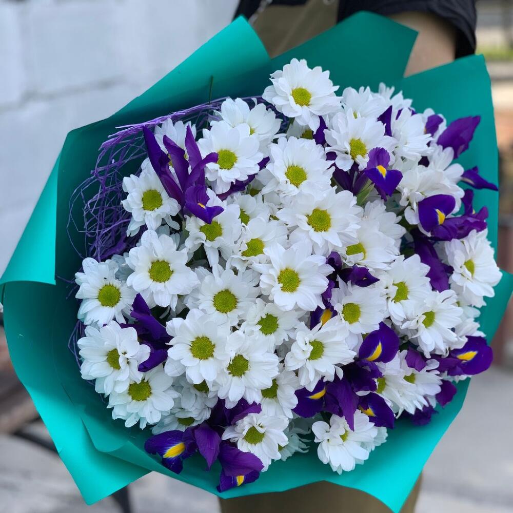 Хризантема кустовая – 9 шт.Зелень – 5 шт.Упаковка дизайнерская – 1 шт.Ирис Blue Magic – 9 шт.