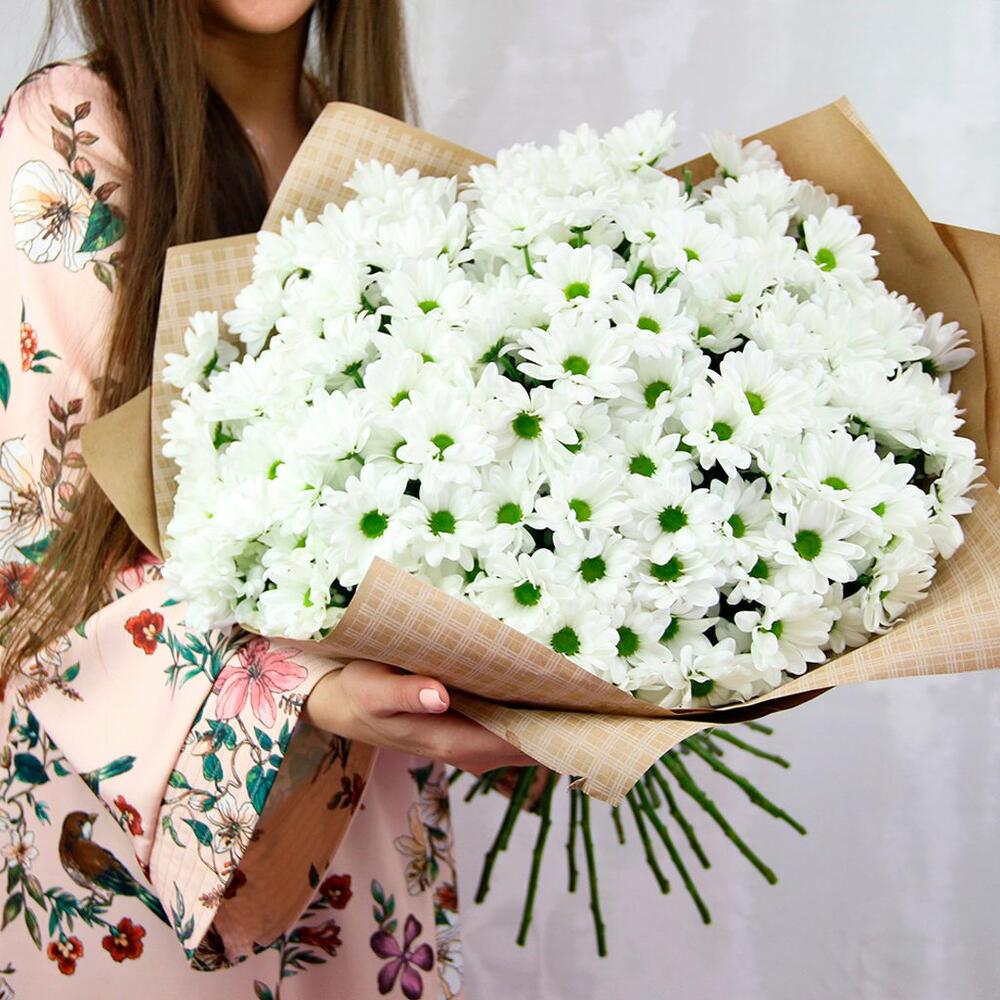 Букет из 25 белых кустовых хризантем Бакарди в стильной упаковке