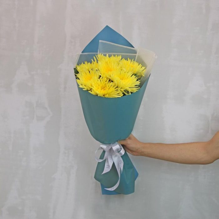 Букет из 7 желтых хризантем Анастасия в стильной упаковке