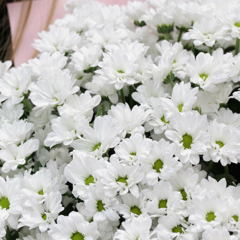 Букет из 75 белых кустовых хризантем Сантини в стильной упаковке