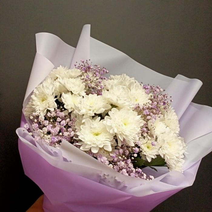 Гипсофила – 2 шт.Хризантема кустовая – 7 шт.Упаковка дизайнерская – 1 шт.