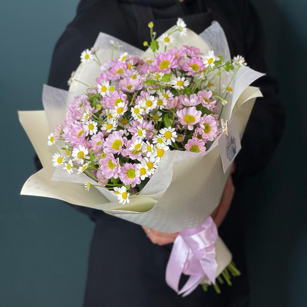Букет с ромашками и кустовой хризантемой “Дыхание лета”