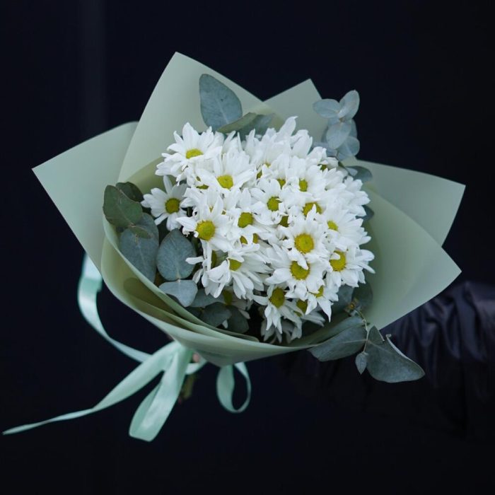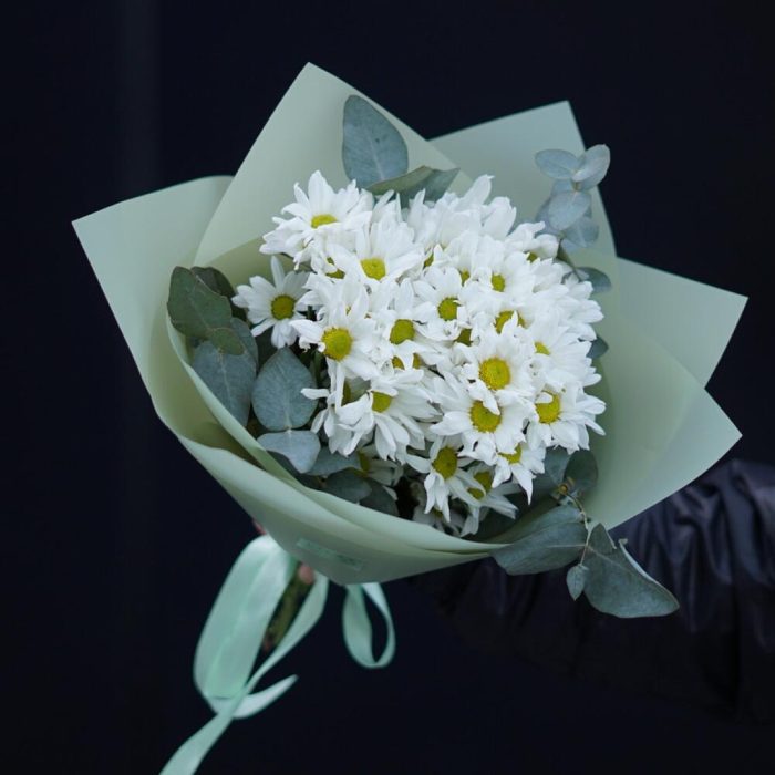 Хризантема кустовая – 9 шт. Эвкалипт – 5 шт. Упаковка дизайнерская – 2 шт. Открыточка с вашими пожеланиями – 1 шт. инструкция по уходу за цветами – 1 шт.